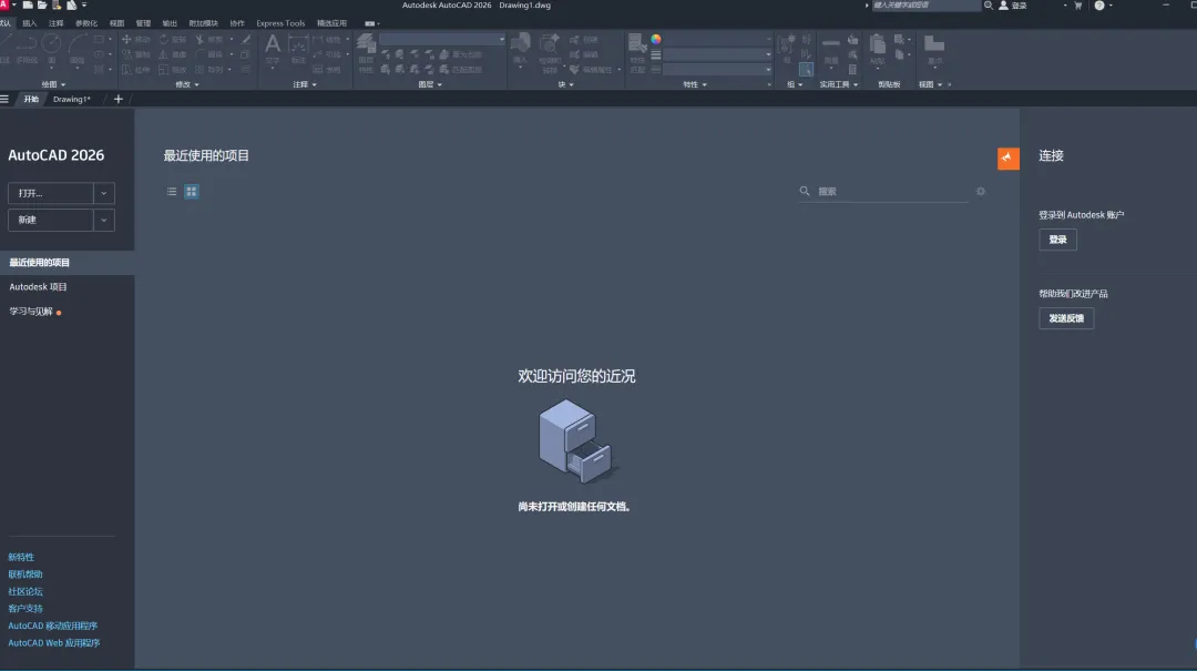 界面优化:AutoCAD 2026对界面进行了重新设计,使其更加简洁、直观、易用。工具栏、菜单栏和绘图区等部分经过精心调整,以提高用户的工作效率。