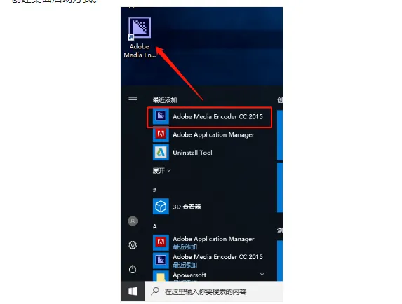 15.在开始菜单找到【Adobe Media Encoder CC 2015】,用鼠标往桌面拖动即可创建桌面启动方式。