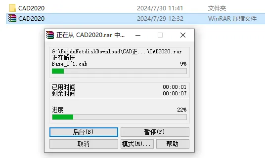 2.压缩包解压中····请等待解压完成。3.打开解压的【CAD2020】文件夹。4.打开【setup】文件夹。5.鼠标右击【setup】安装程序,选择【以管理员身份运行】。6.点击【安装】。7.选择【我接受】,然后点击【下一步】。8.点击【浏览】设置CAD软件安装路径,建议安装到除C盘以外的磁盘,可自行设置,设置好安装路径后点击【安装】。9.软件安装中···请耐心等待安装进度走完即可。