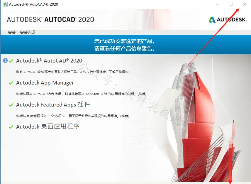 10.安装完成后,在右上角关闭安装界面(切记先不要打开CAD软件)。11.若出现如下图所示的提示,直接点击【确定】,没有则忽略进行下一步骤。12.返回到开头解压的文件夹中,然后打开【crack】文件夹。13.鼠标右击【acad】文件选择【复制】。14.在桌面上找到AutoCAD 2020软件图标,鼠标右击点击【打开文件所在的位置】。15.在打开的文件夹空白处,鼠标右击选择【粘贴】。16.点击【替换目标中的文件】。17.在桌面上打开【AutoCAD 2020】软件。18.若出现下图所示的界面,直接点击【始终将DWG文件与AutoCAD重新关联】(若没有该界面直接忽略)。19.安装完成,CAD软件打开界面如下图所示(已激活,可无期限使用)。