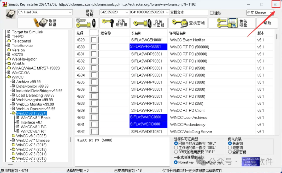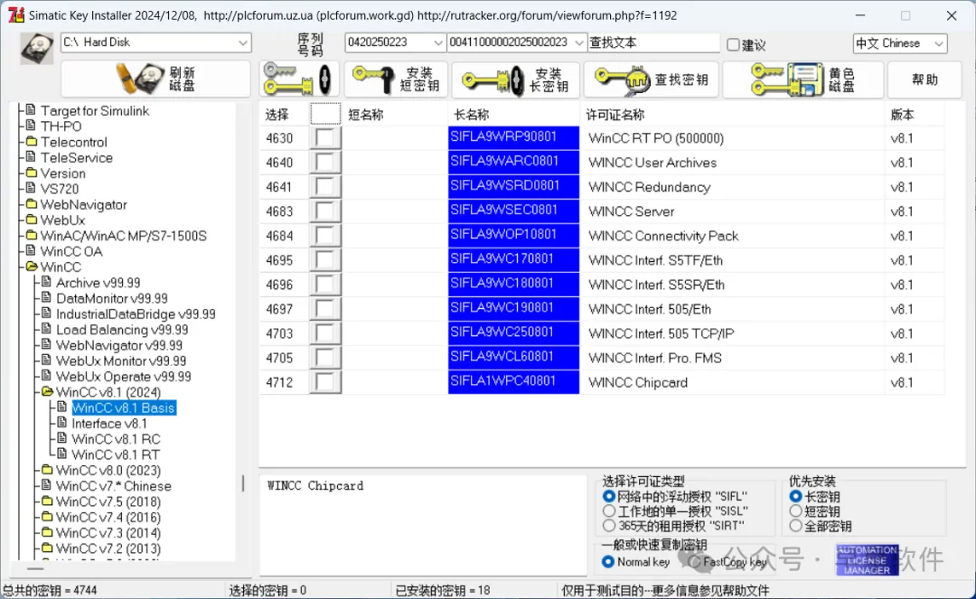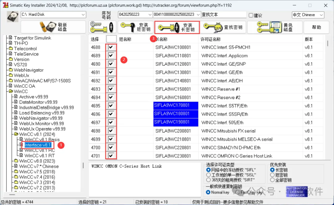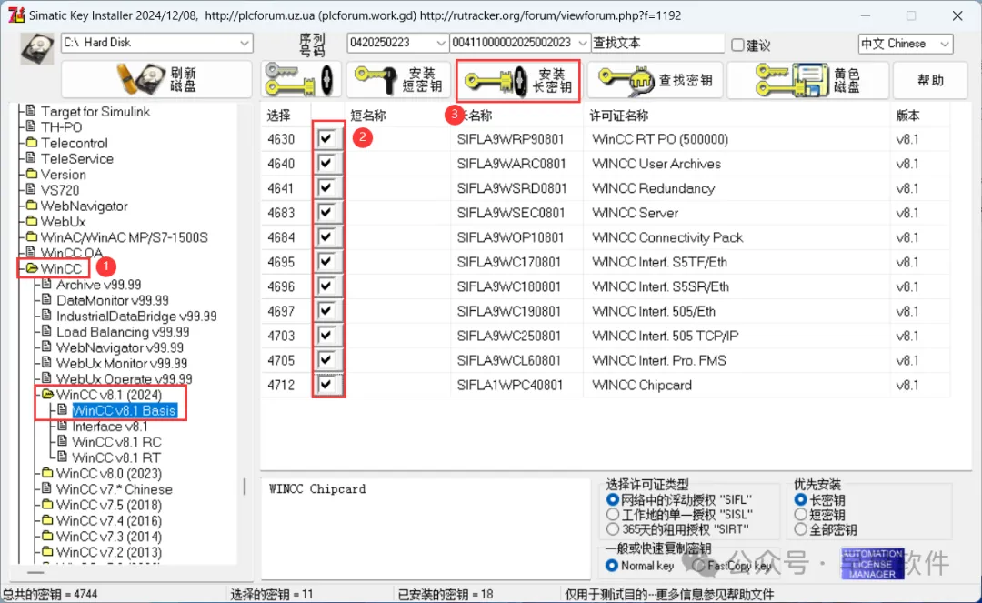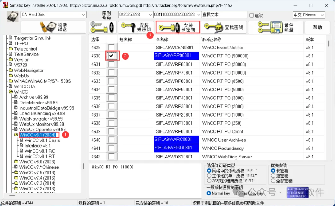 32、点击【WinCC v8.1(2024)】,勾选【4630】短名称,再点击【安装长密钥】