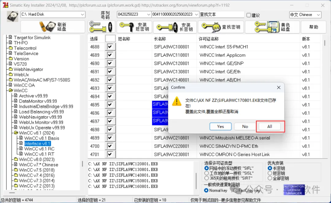 28、依次双击左侧的【WinCC】、【WinCC v8.1(2024)】、【WinCC v8.1 Basis】,勾选全部【短名称】,再点击【安装长密钥】
