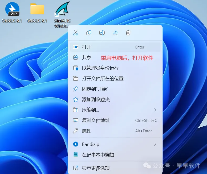 34、重启电脑,回到桌面,右键桌面上的【SIMATIC WINCC 8.1软件图标】,点击【打开】