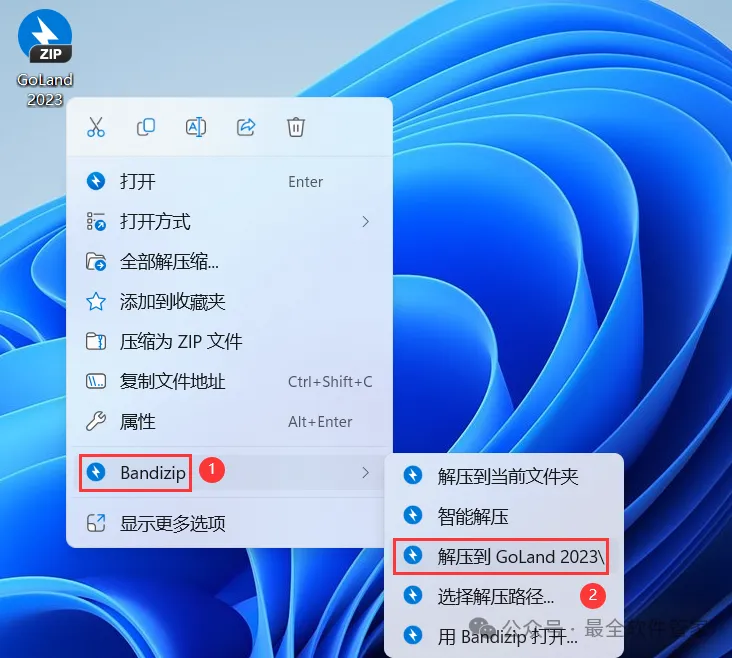 1、下载GoLand 2023软件安装包到电脑上,右键选择【解压到GoLand 2023\】