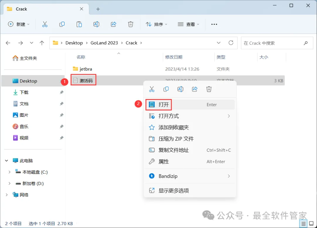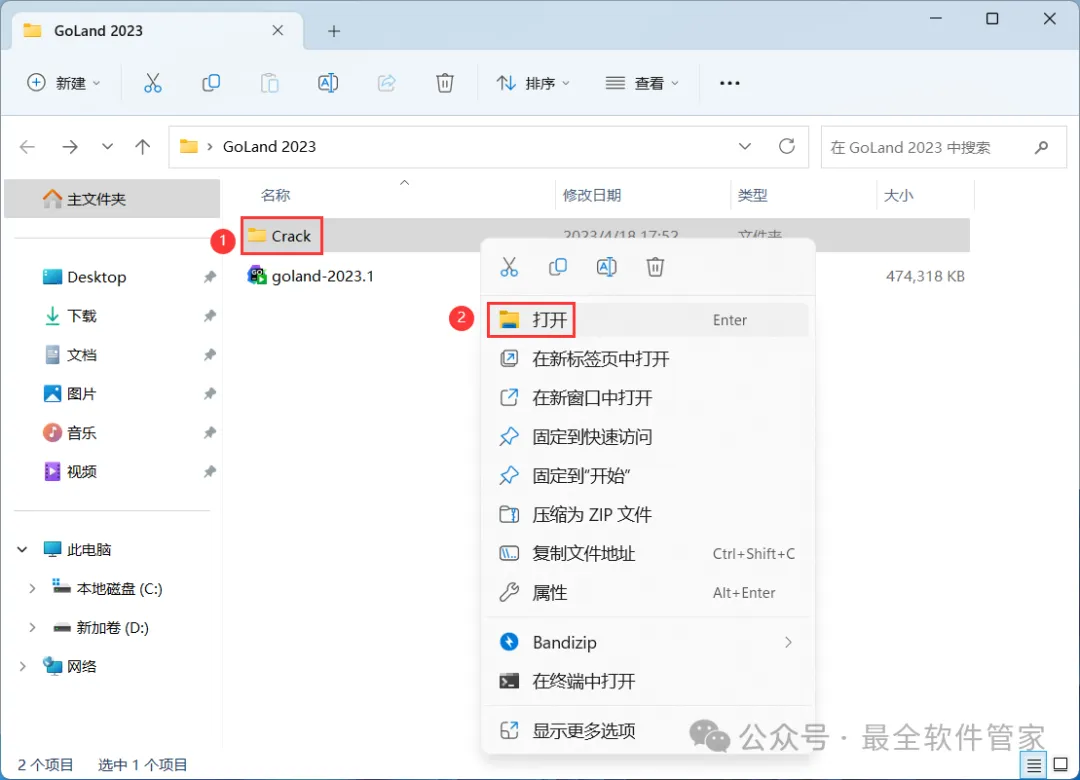 10、回到GoLand 2023文件夹,找到【Crack】文件夹,右键【打开】它