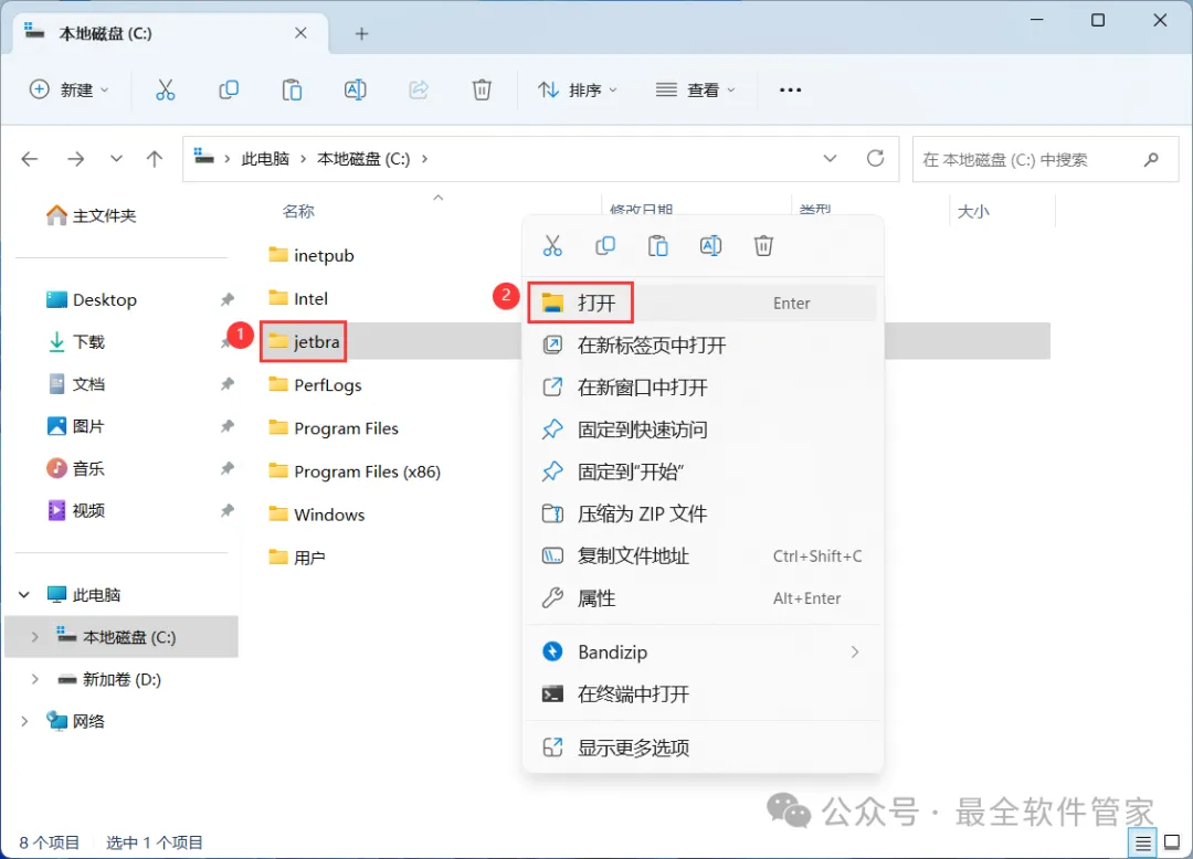 13、找到粘贴的【jetbra】文件夹,右键【打开】它