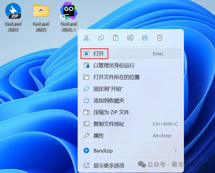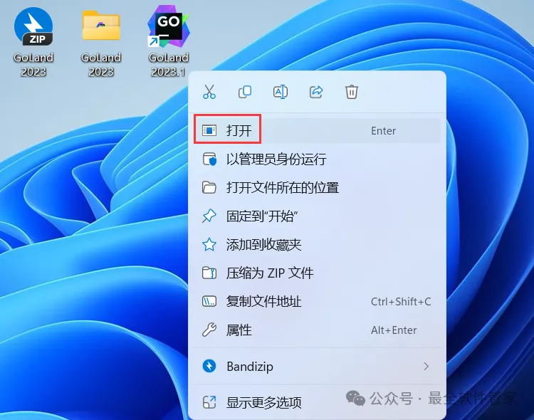 18、回到桌面,右键桌面上的【GoLand 2023.1软件图标】,点击【打开】