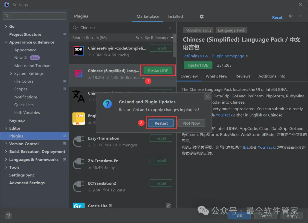 30、点击【Plugins】,在搜索框输入【Chinese】,找到【Chinese(Simplified)…】程序,再点击【Install】