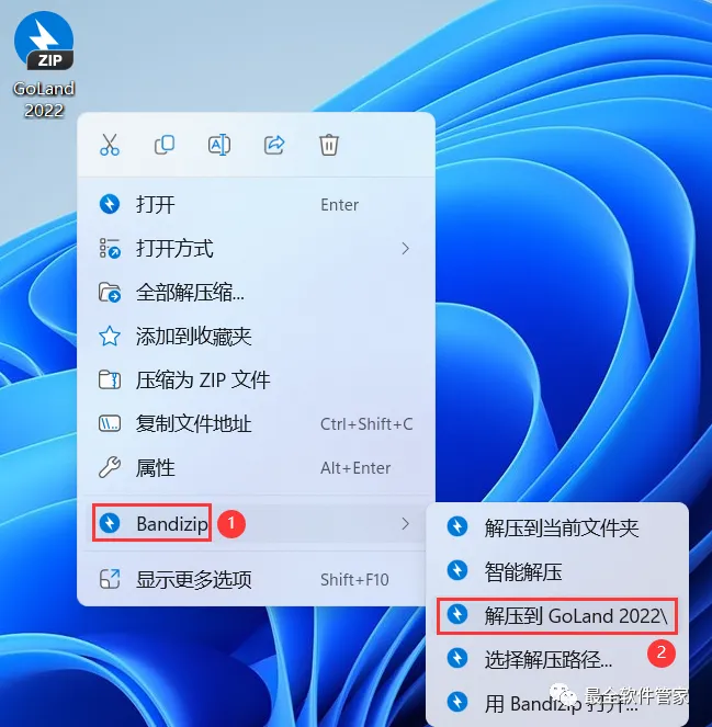 1、下载GoLand 2022软件安装包到电脑上,右键选择【解压到GoLand 2022\】