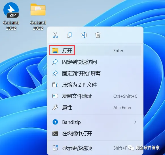 22、回到桌面,右键桌面上的【GoLand 2022.1.3软件图标】,点击【打开】