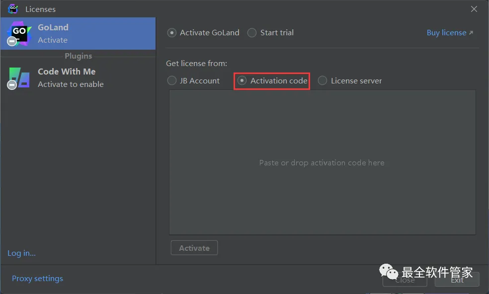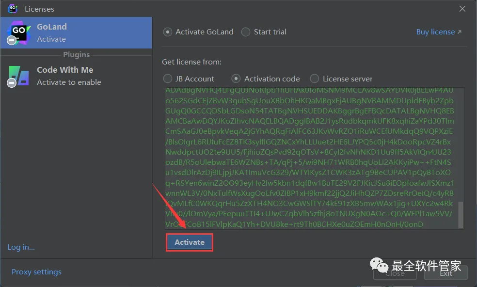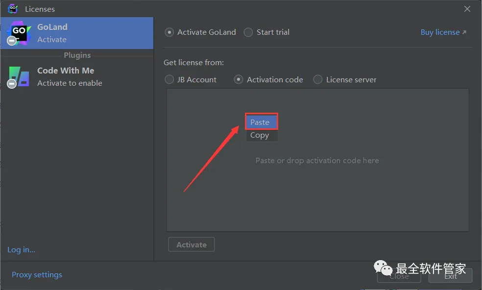 29、回到GoLand 2022.1.3软件界面,右键Activation code下的空白处,点击【Paste】