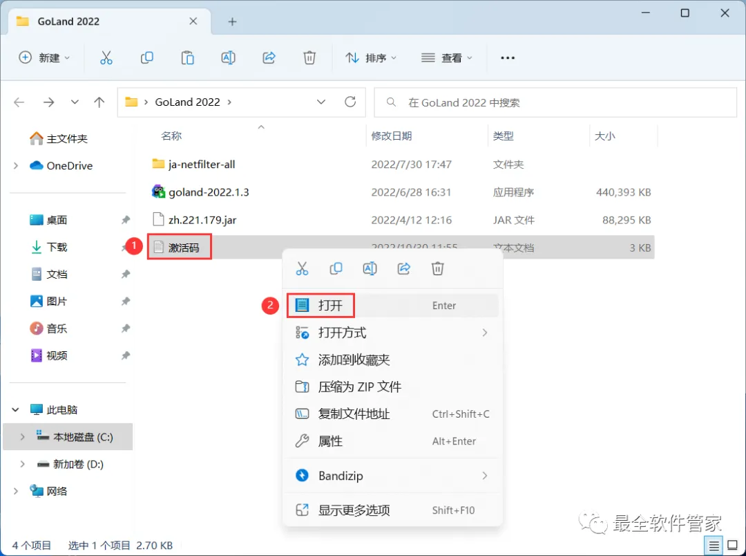 26、回到GoLand 2022文件夹,找到【激活码】文件,右键【打开】它