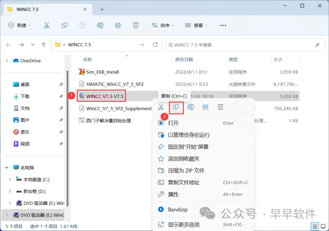 19、回到WINCC 7.5文件夹,找到【WinCC V7.3-V7.5】程序,右键点击【复制按钮】