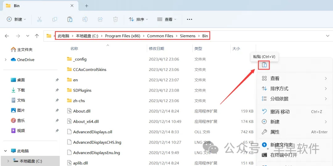 20、打开路径:C:\Program Files (x86)\Common Files\Siemens\Bin,再右键文件夹的空白处,点击【粘贴按钮】