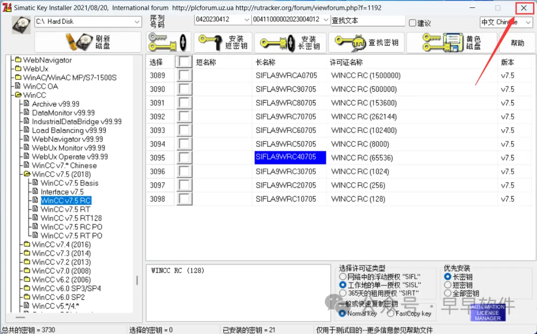 29、依次点击【WinCC】、【WinCC v7.5(2018)】、【WinCC v7.5 RC】,短名称勾选【3095】,勾选【工作地的单一授权“SISL”】,再点击【安装长密钥】
