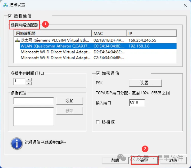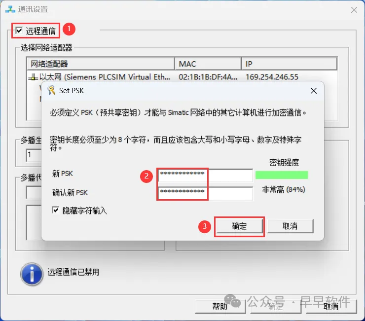 31、重启电脑,自动弹出【远程通信设置】,勾选【远程通信】,设置【PSK】,再点击【确定】