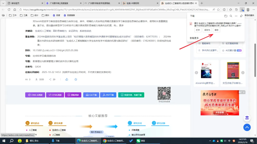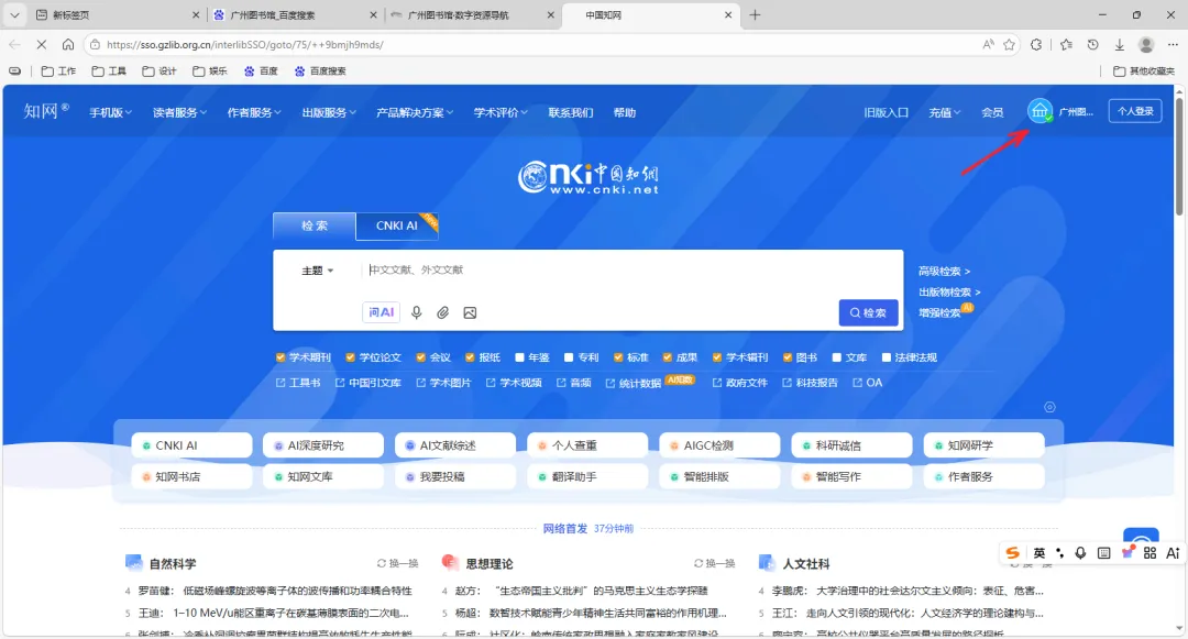 自动跳转到中国知网首页,此时发现右上角登录用户为广州图书馆。