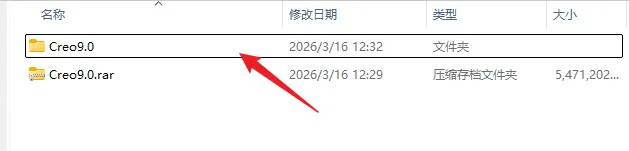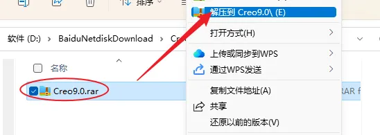 1.解压安装包:鼠标右击【Creo 9.0】压缩包,选择电脑上安装的解压软件,点击【Creo 9.0】。