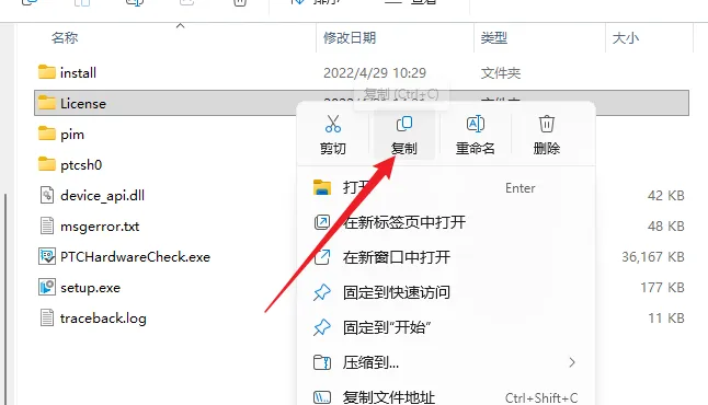 7.打开安装包解压后的【Creo9.0】文件夹,鼠标右击【License】文件夹选择【复制】。