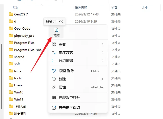 8.打开磁盘(如:D盘,或其他盘),在空白处鼠标右击选择【粘贴】。