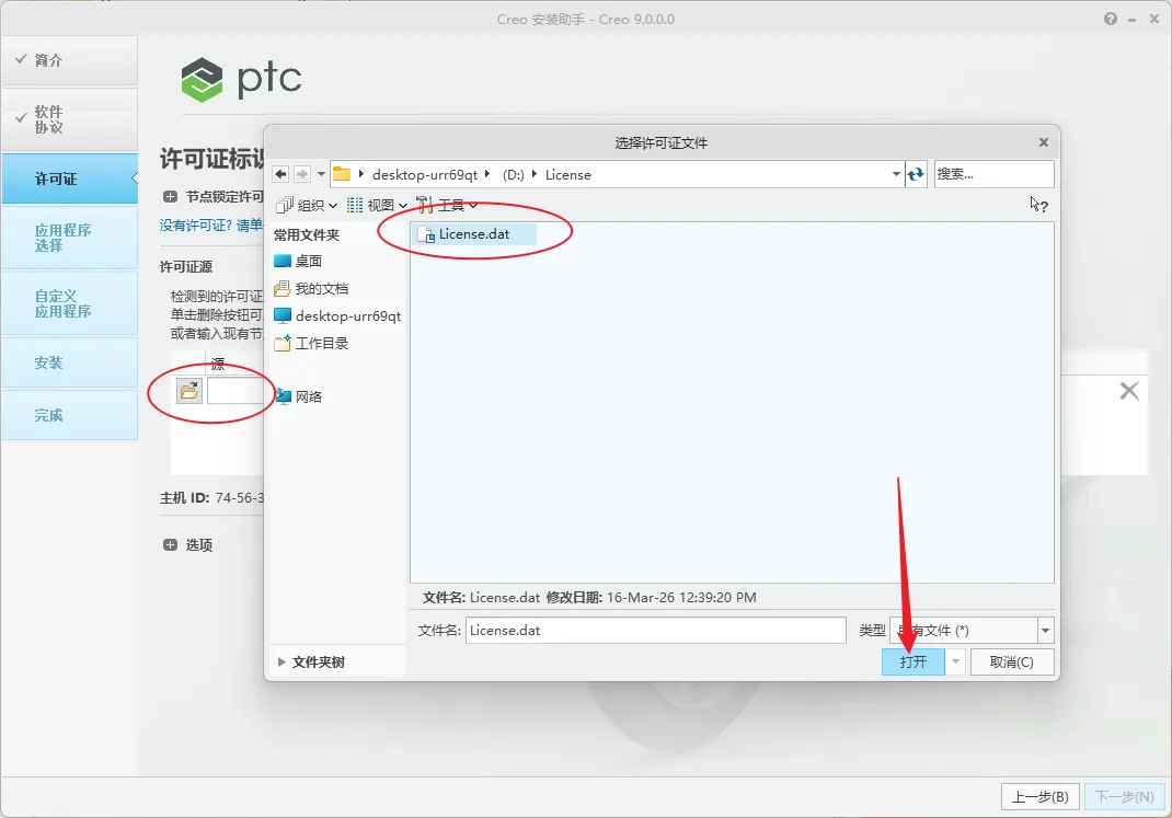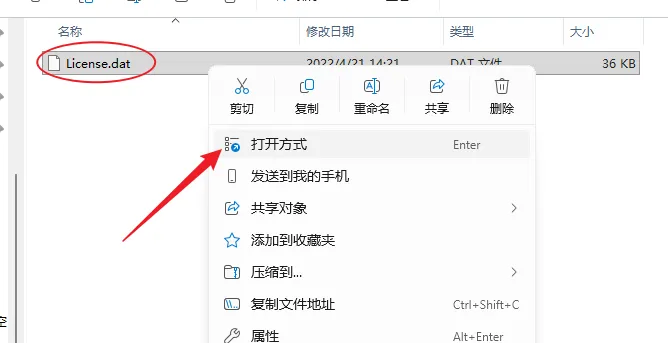 9.打开粘贴后的【License】文件夹,鼠标右击该文件夹下的【License.dat】选择【打开方式】。