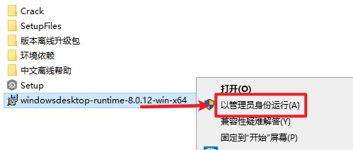 2.打开刚刚解压的文件夹,选中“windowsdesktop-runtime-8.0.12-win-x64”右键选择“以管理员身份运行”