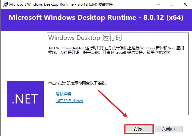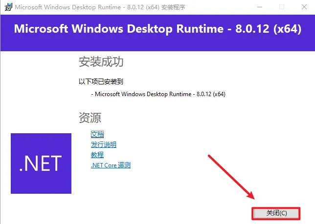 4.点击“关闭”(如果已安装了windowsdesktop-runtime-8.0.12运行组件,请直接跳到第5步)