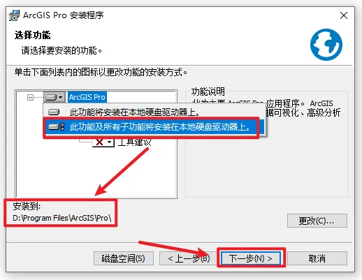 10.点击“倒三角展开符“,选择“此功能及所有子功能将安装到本地硬盘驱动器上“,选择软件安装路径,安装路径不要出现中文,点击“下一步”
