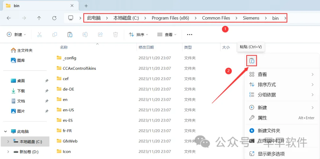 23、打开路径:C:\Program Files (x86)\Common Files\Siemens\Bin,再右键文件夹的空白处,点击【粘贴按钮】