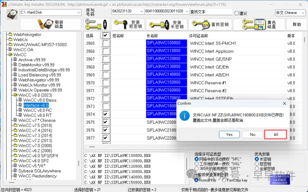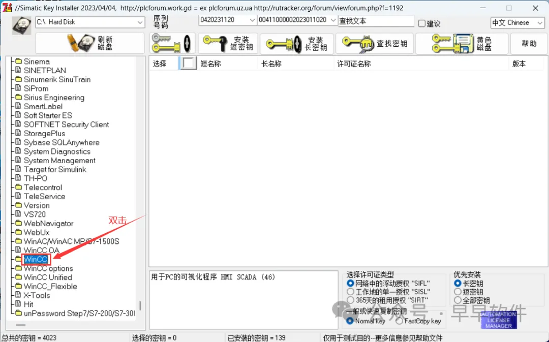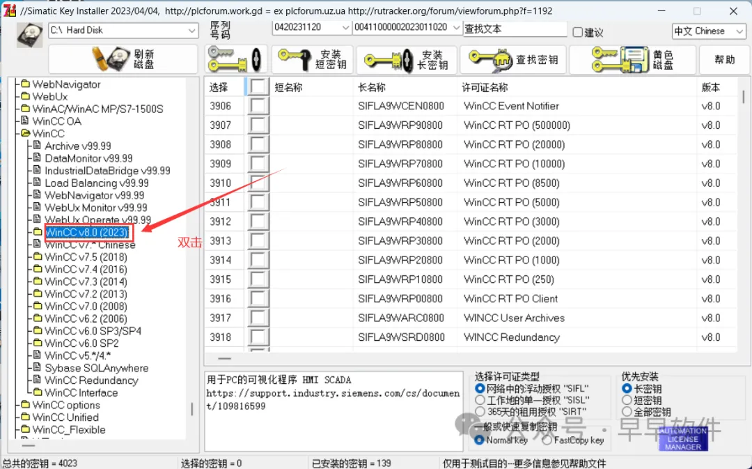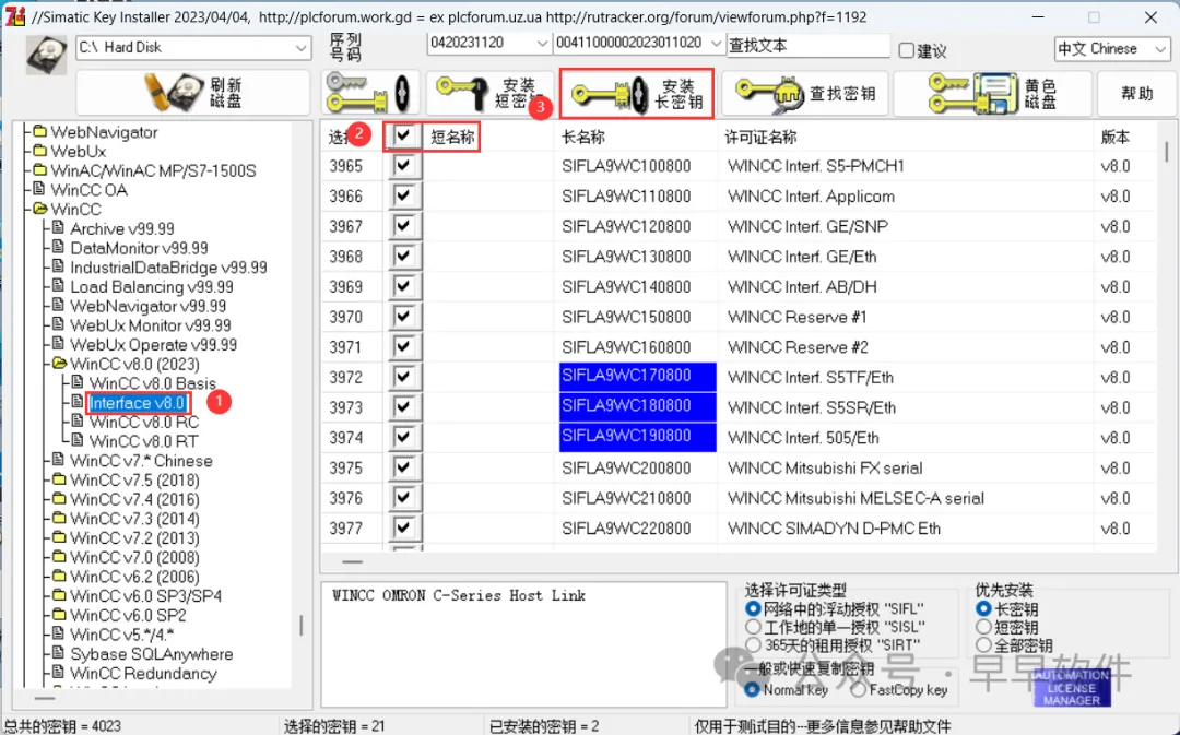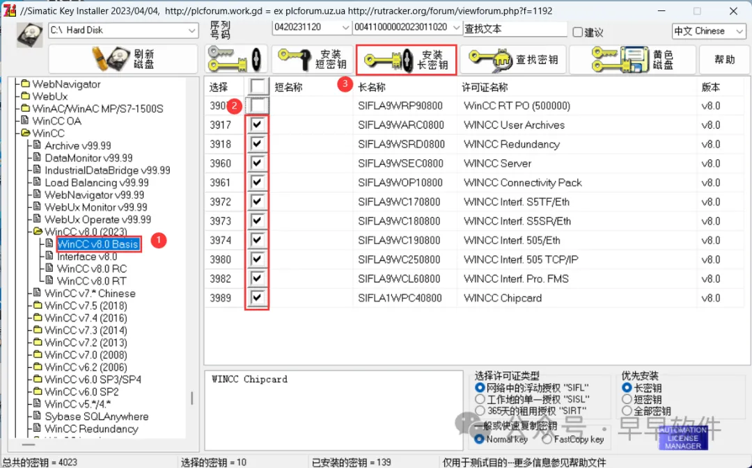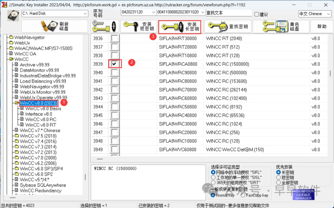 35、依次点击【WinCC v8.0(2023)】,勾选【3939】短名称,再点击【安装长密钥】