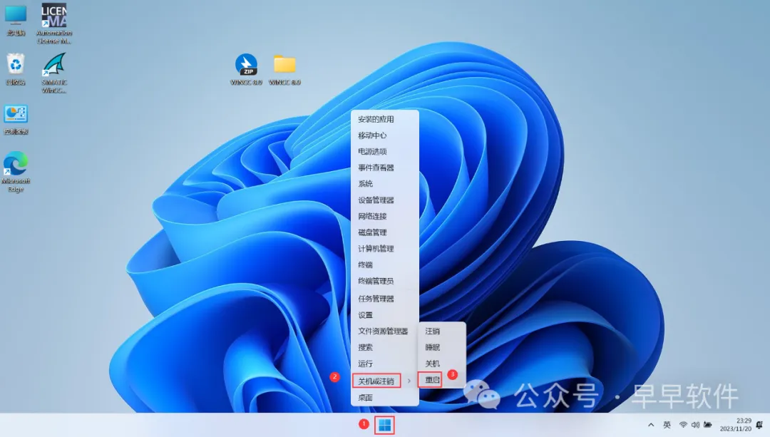 37、回到桌面,右键任务栏的【开始菜单】,依次点击【关机或注销】、【重启】,重启电脑