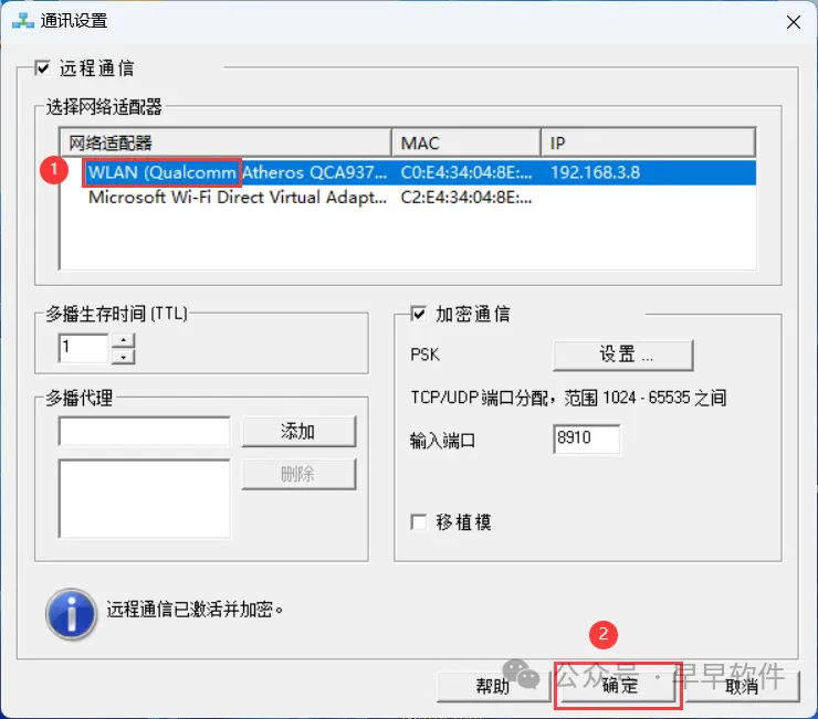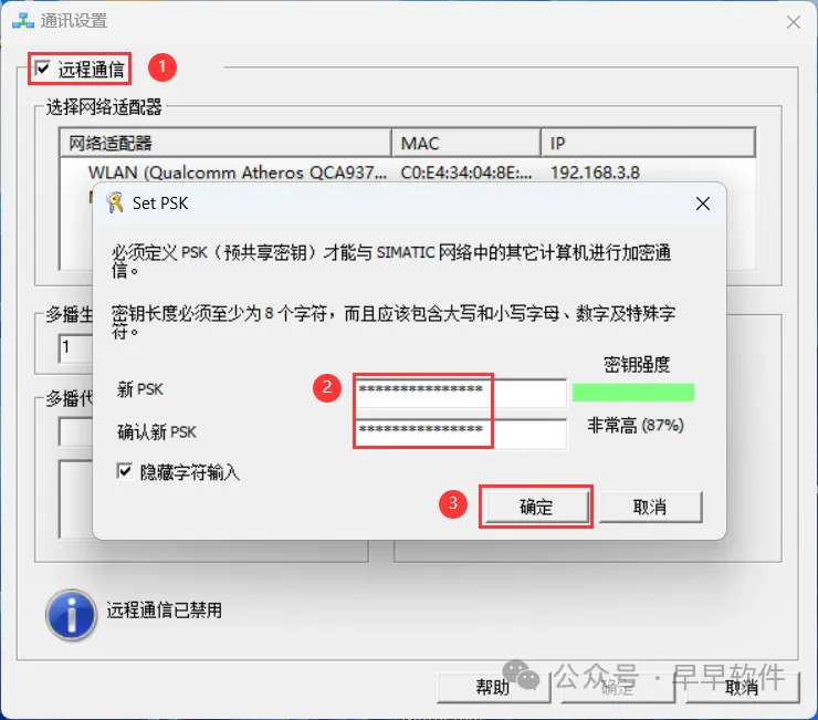 38、自动弹出【远程通信设置】,勾选【远程通信】,设置【PSK】,再点击【确定】