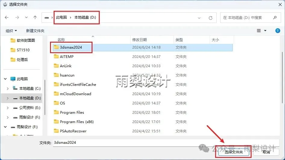 6.选择D盘,在D盘新建一个文件夹(名称不能是中文);点击【选择文件夹】