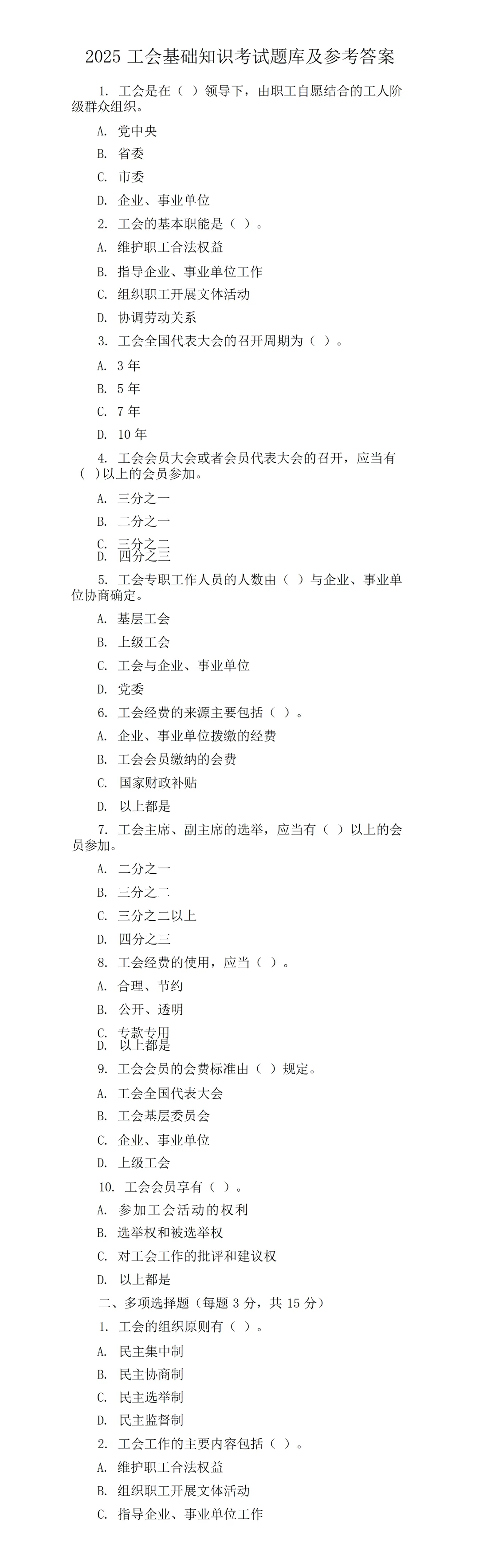 当前位置:首页>免费下载>【免费下载】2025工会基础知识考试题库及参考答案.docx