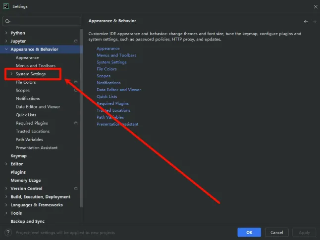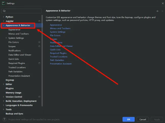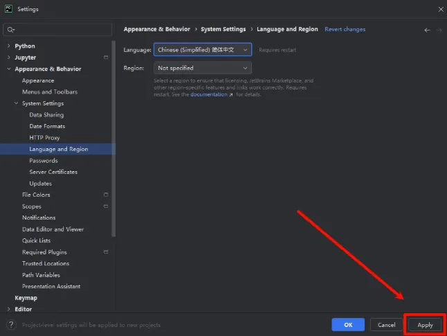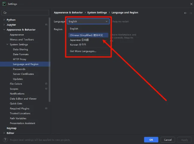 3,点击【Appearance & Behavior】。5,点击【Language and Region】。6,点击【Language】右侧的复选框,选择自己需要的语言。9,稍等片刻,软件会自动重启重启后软件语言就是你刚刚选择的语言版本了。 声明:我们提供用户下载的所有内容均来自互联网收集,仅供学习交流,请于下载后的24小时内删除,如需体验更多乐趣,请支持正版,如有内容侵犯您的版权或其他利益的,请联系我们会在收到消息后24小时内处理。如果给你造成不好的体验,请划走谢谢。