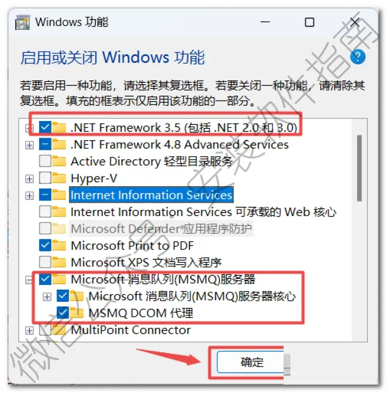 2、如果没有安装按以下步骤操作,点选“.NET Framework 3.5”和“Microsoft消息队列(MSMQ)服务”,点击“确定”,等待更改完成,点击“关闭”(若出现其他提示点击“让Windows更新为你下载文件”,等待下载安装完成即可)