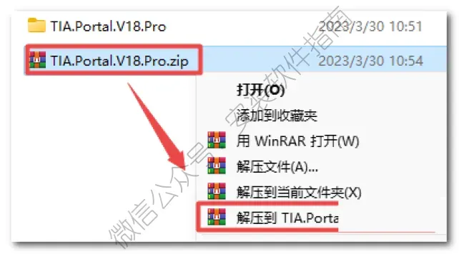 3、选中下载的安装包,鼠标右键选择解压到“TIA.Portal.V18.Pro”(注意:安装包所在的路径不要中文字,建议最好放在C盘根目录安装,装完后删除即可)