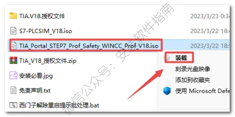6、返回解压的”TIA.Portal.V18.Pro“文件夹,选中“TIA_Portal_STEP7_Prof_Safety_WINCC_Prof_V18”iso文件,鼠标右键选择“装载”(如果没有“装载”选项的可以右键选择“打开方式—Windows资源管理器”打开,Win7系统直接右键解压)