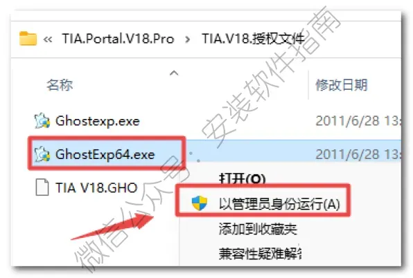 27、返回解压的“TIA.Portal.V18.Pro”文件夹,双击打开“TIA-V18授权文件”文件夹,鼠标右键点击“GhostExp64.exe”选择“以管理员身份运行”
