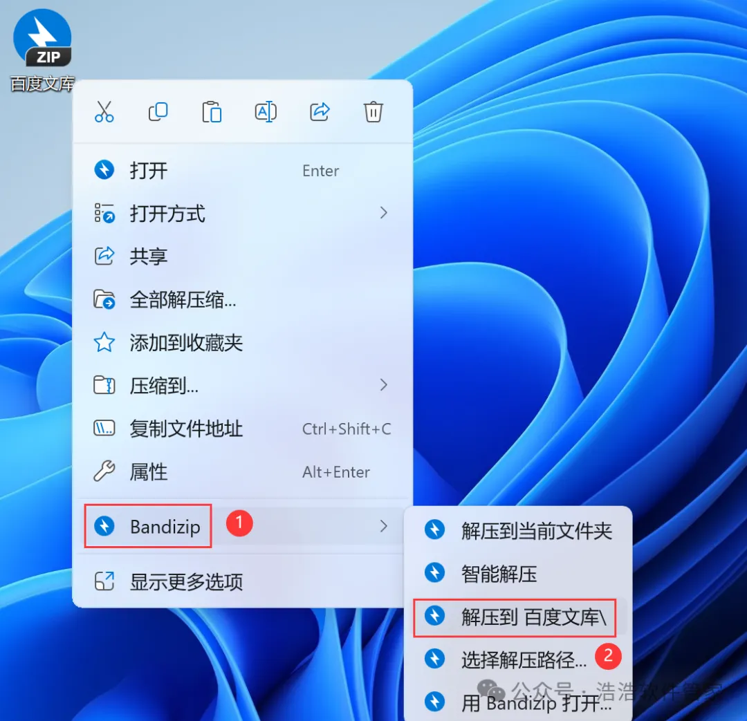 1、下载百度文库软件安装包到电脑上,右键选择【解压到百度文库\】