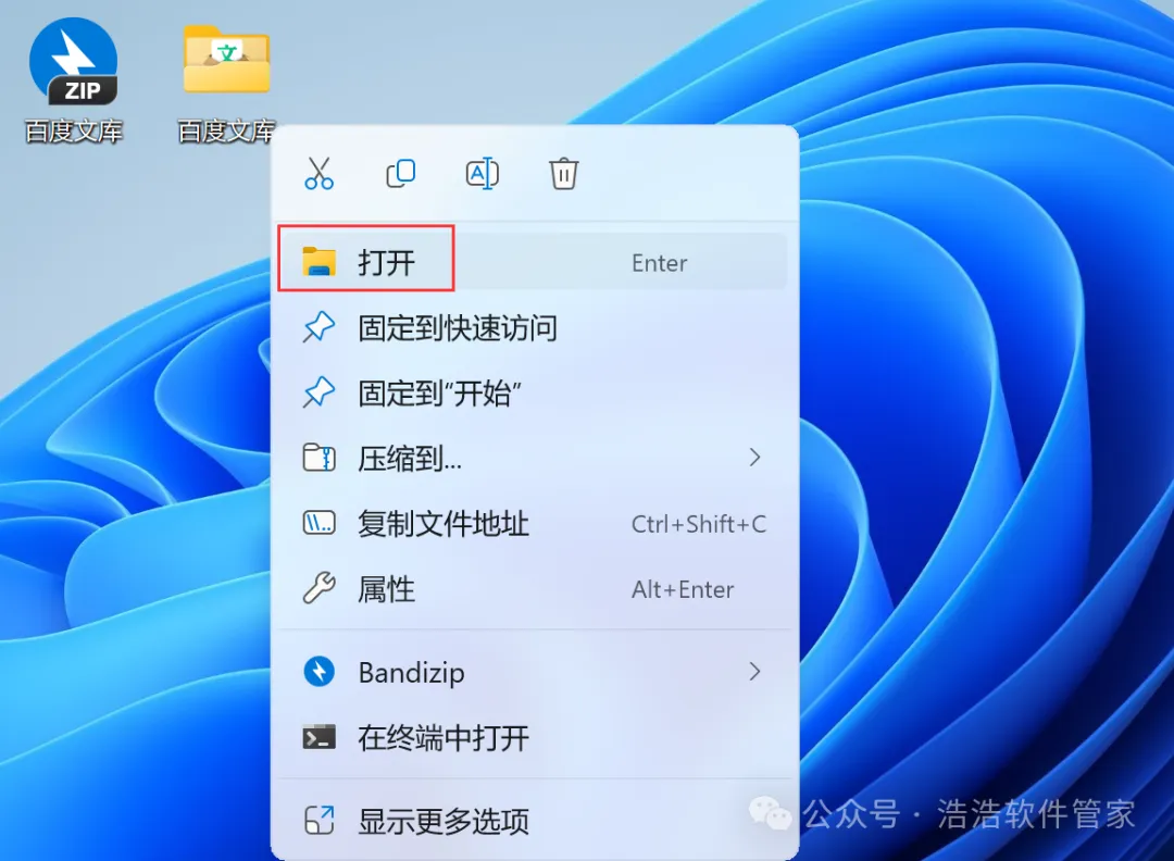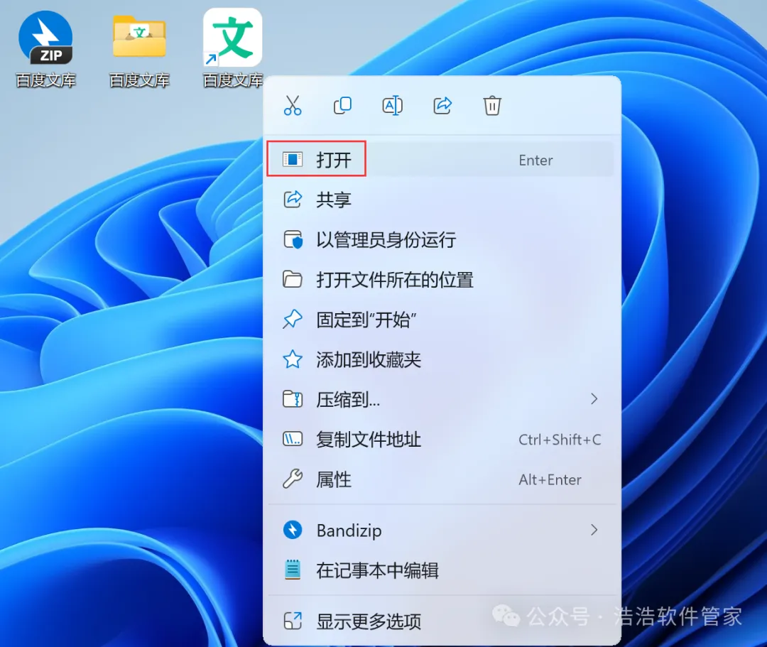8、回到桌面,右键桌面上的【百度文库软件图标】,点击【打开】