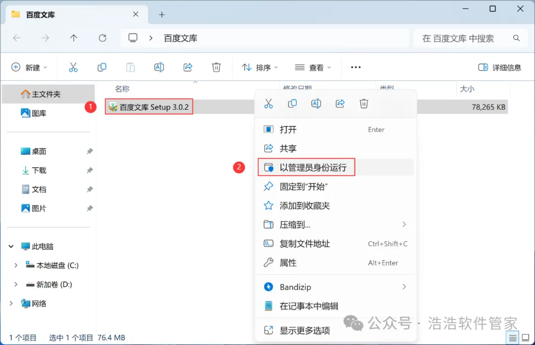 3、找到【百度文库】应用程序,右键选择【以管理员身份运行】它