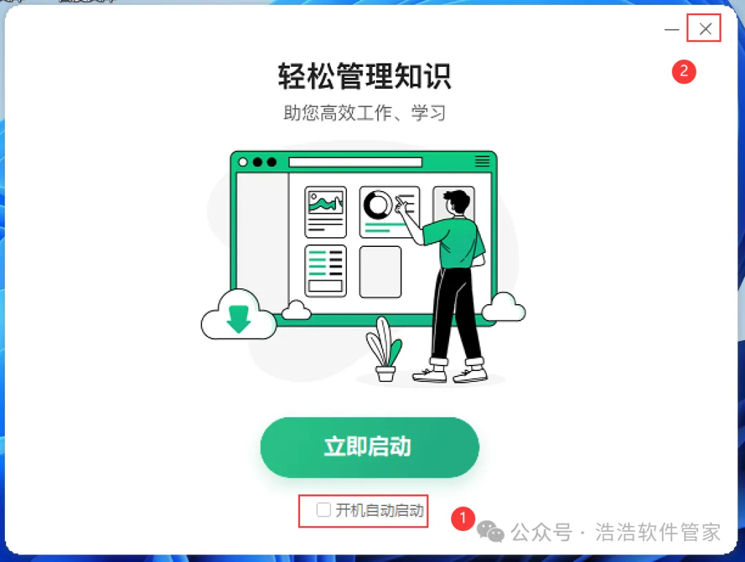 7、软件安装成功,取消勾选【开机自动启动】,再点击右上角【关闭按钮】
