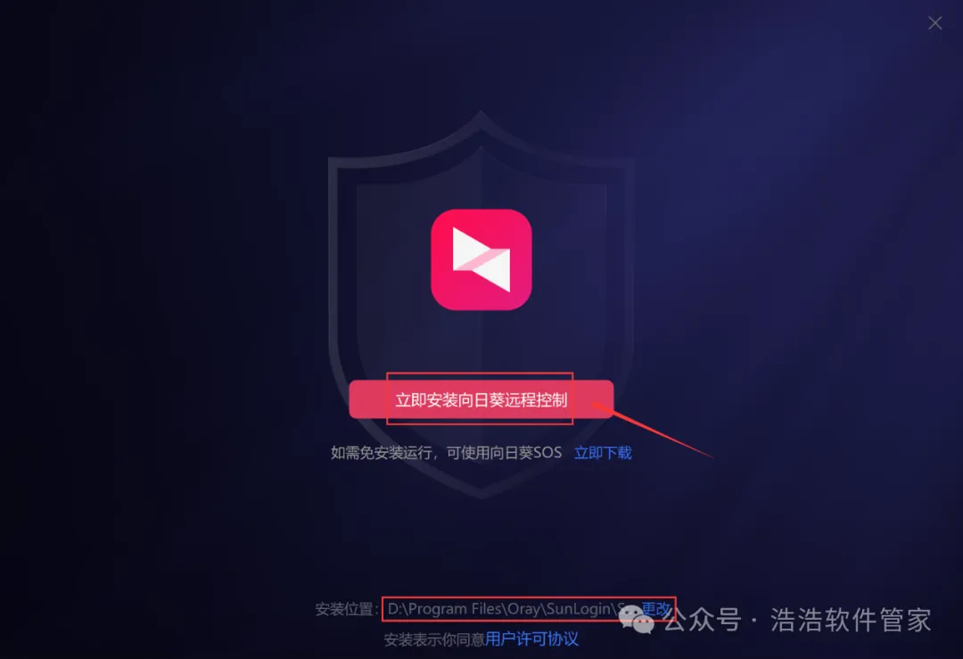 4、软件默认安装在C盘,可自定义更改软件安装位置,这里小编选择安装在D盘;点击【立即安装向日葵远程控制】