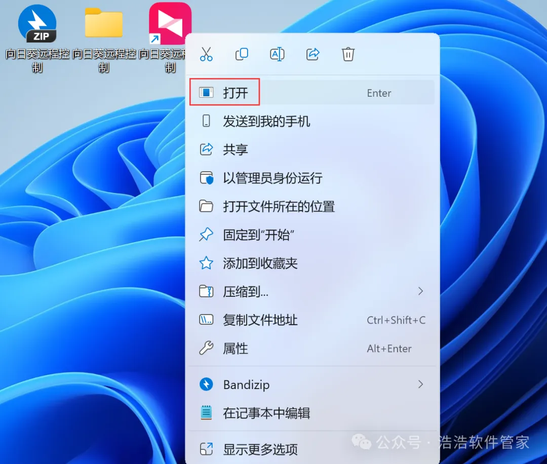 7、回到桌面,右键桌面上的【向日葵远程控制软件图标】,点击【打开】