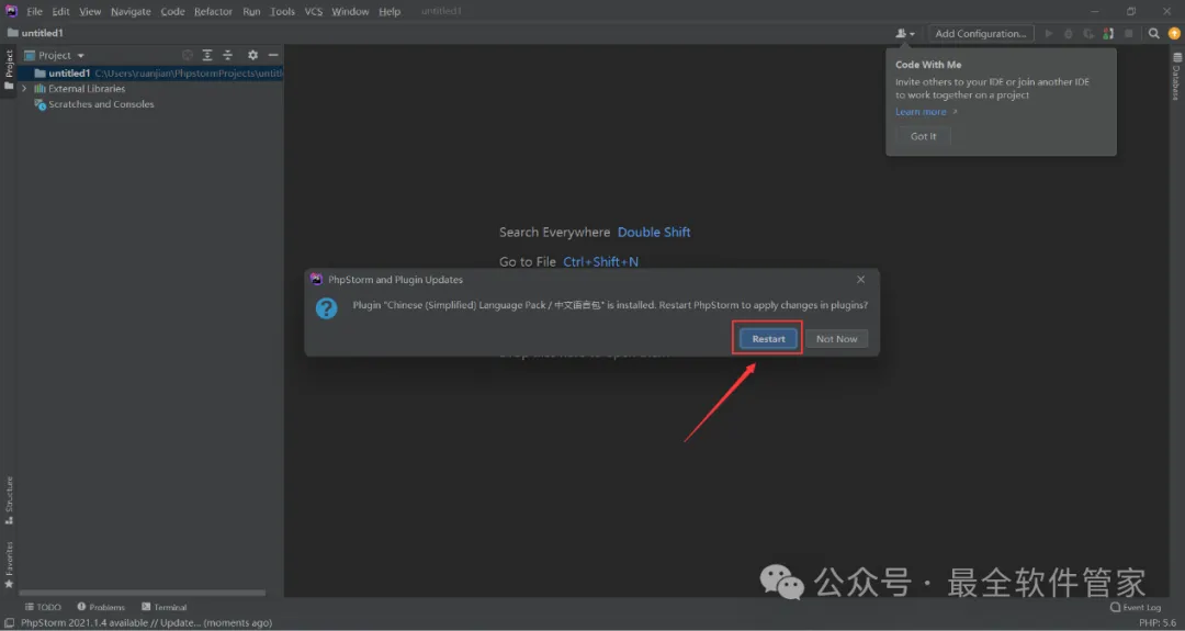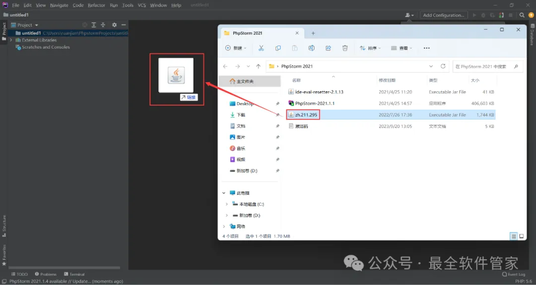 22、回到PhpStorm 2021文件夹,将【zh.211.295】文件拖到软件界面内