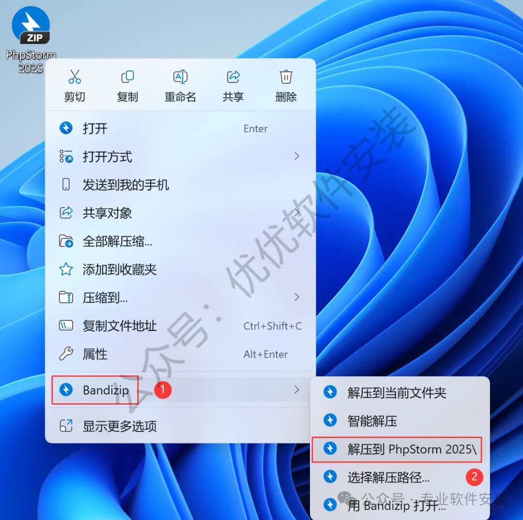 1、下载PhpStorm 2025软件安装包到电脑上,右键选择【解压到PhpStorm 2025\】