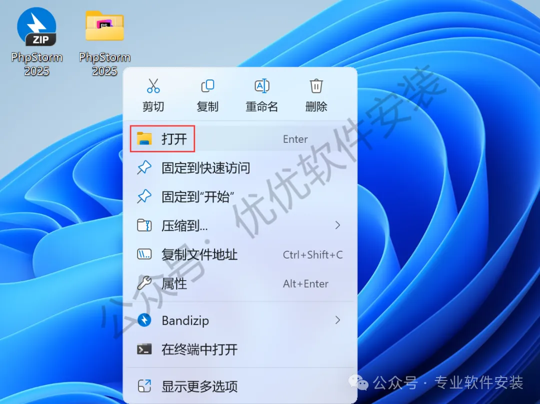 21、回到桌面,右键桌面上的【PhpStorm 2025软件图标】,点击【打开】