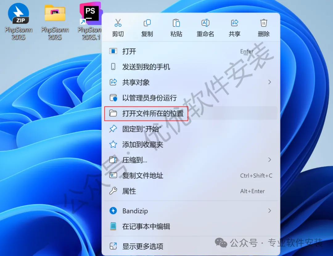17、回到桌面,右键桌面上的【PhpStorm 2025.1软件图标】,点击【打开文件所在的位置】