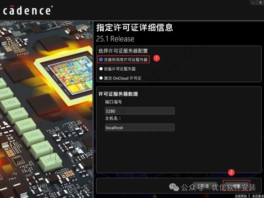 8、勾选【连接到现有许可证服务器】,再点击【安装】